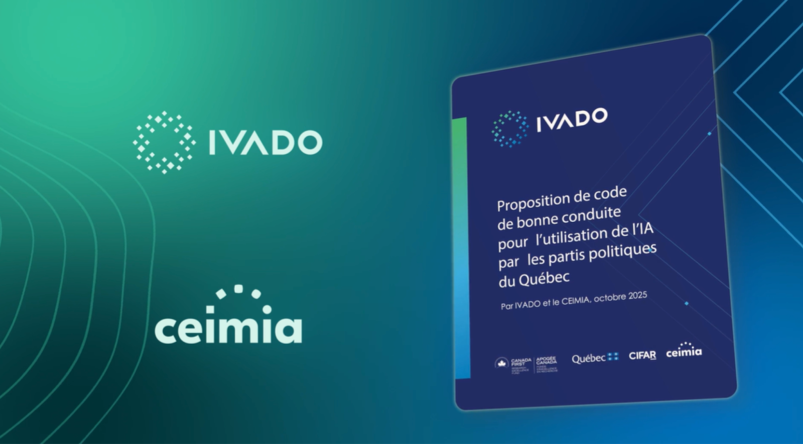 Dans ce contexte, l’Assemblée nationale a adopté à l’unanimité le 24 mars 2026 une motion demandant à l’ensemble des partis politiques représentés en son sein d’adhérer « sans délai » au code de bonne conduite pour un usage responsable de l’IA par les partis politiques du Québec élaboré par IVADO et le CEIMIA.